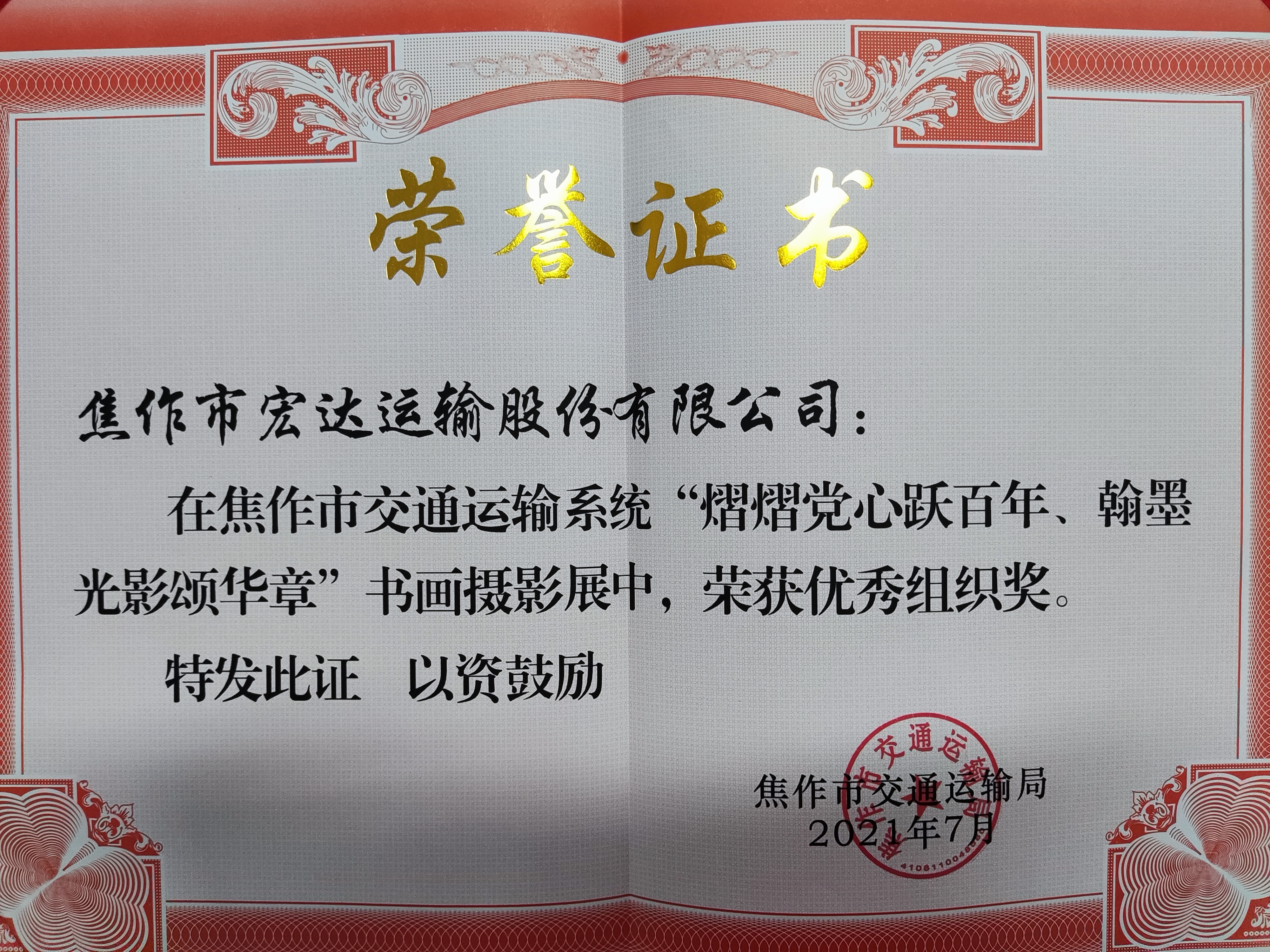 我公司在市交通运输系统组织的“熠熠党心跃百年、翰墨光影颂华章”书画摄影展中,荣获了优秀组织奖,彰显了宏达公司的企业风采和文化底蕴。