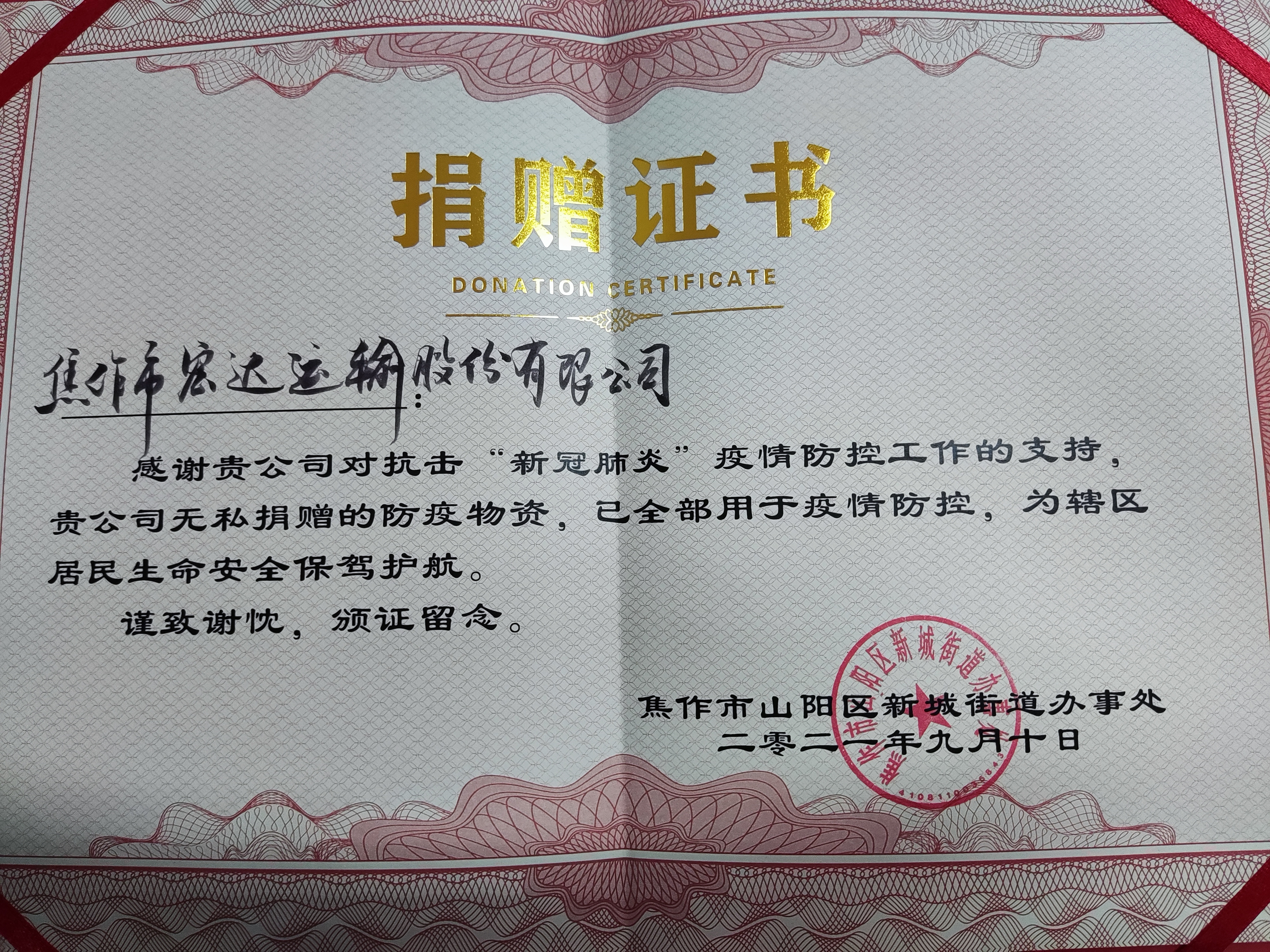 金秋九月,硕果累累,今日我公司收到了市交通运输局和山阳区新城街道办事处的荣誉证书和捐赠证书。