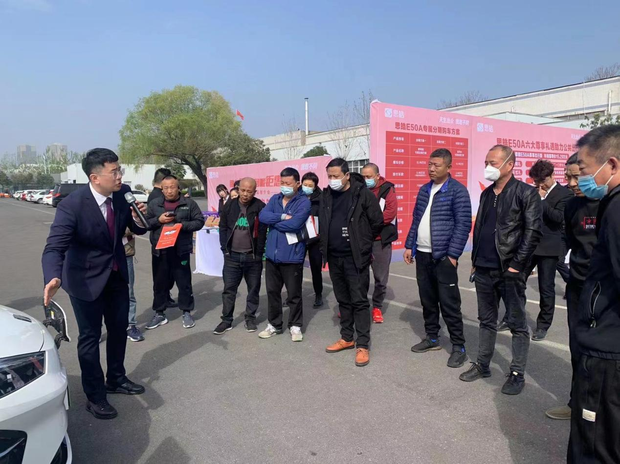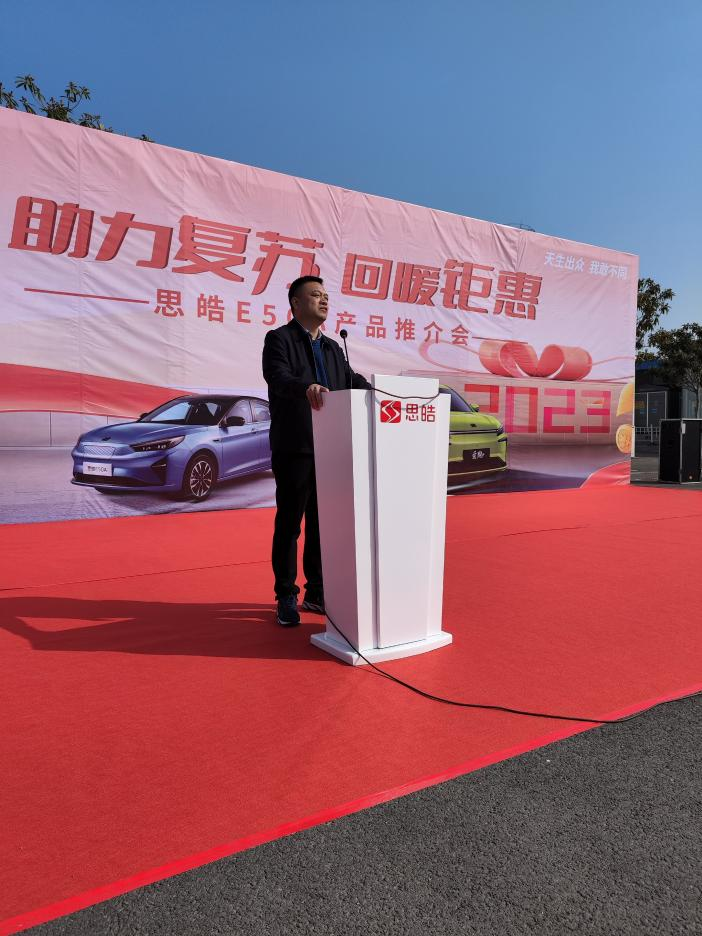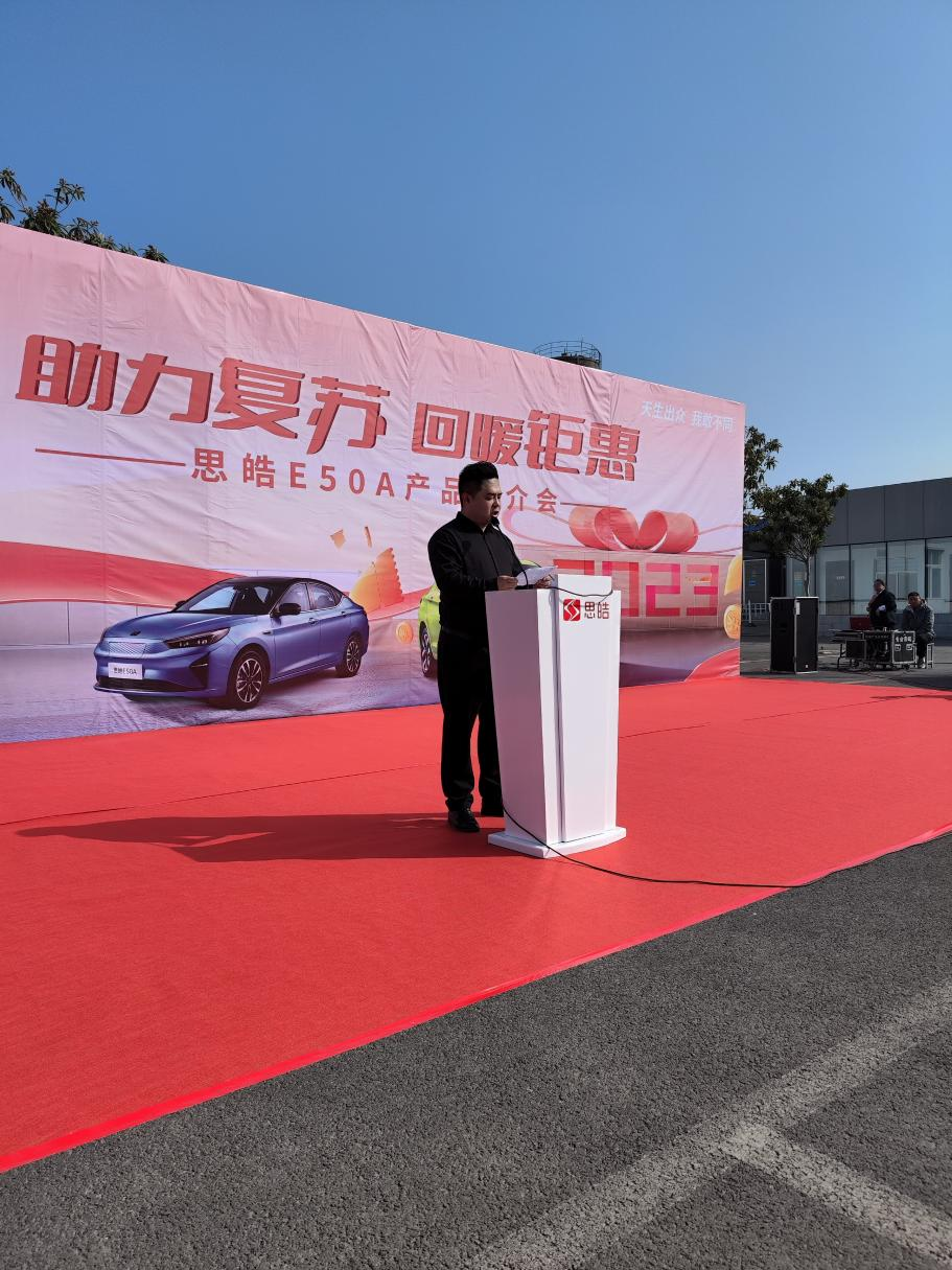 活动首先由焦作市思皓星耀新能源汽车销售有限公司总经理丁祖民致欢迎辞,他先是对今日能够从百忙之中到来的各位领导以及司机朋友表示衷心的感谢,随后对思皓品牌及思皓星耀 4S店做简单介绍,最后对E50A车型的未来发展方向布绘蓝图。