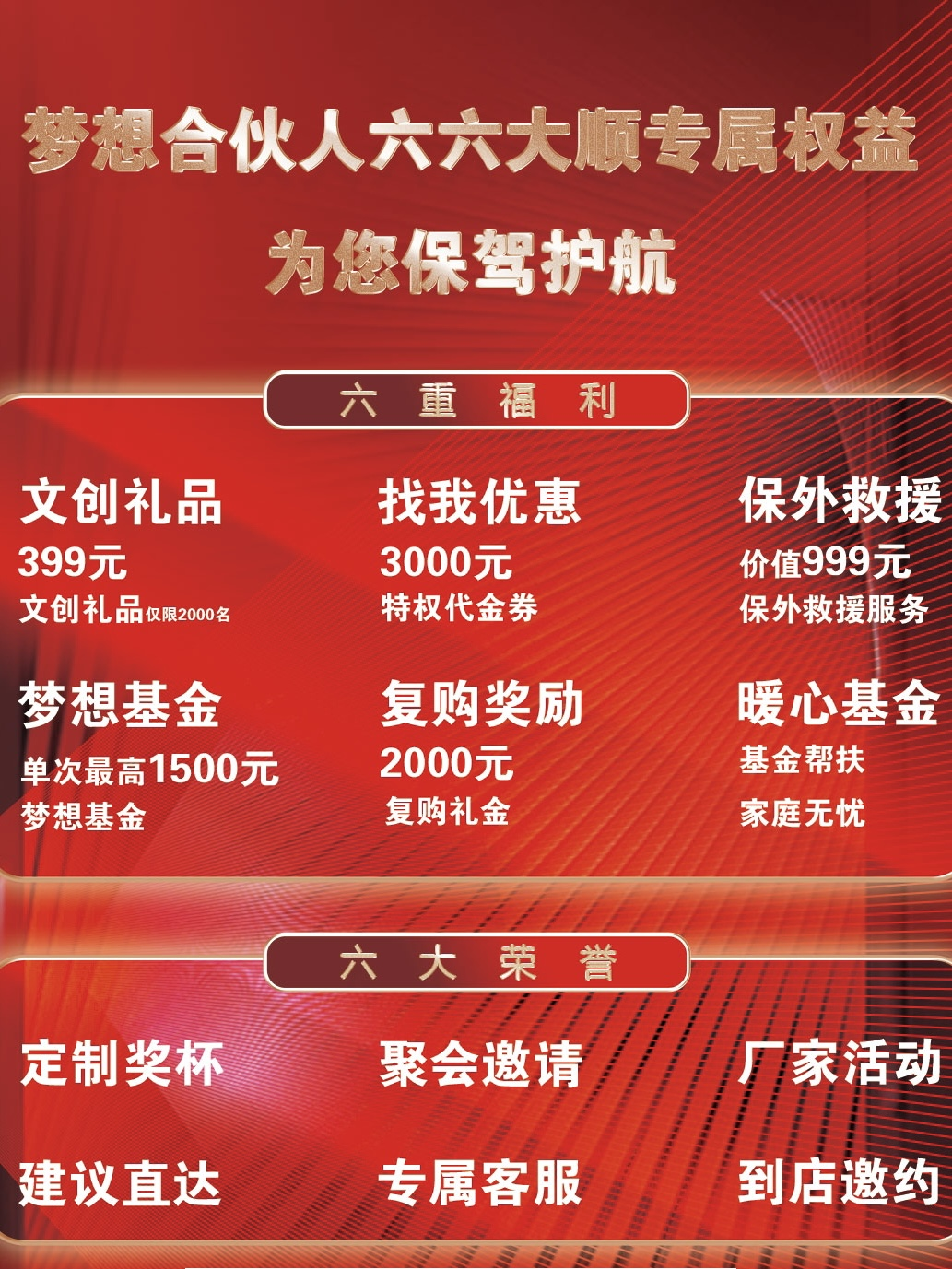 而梦想旅程的开启,限时一个月 5 倍成长值,让大家直升正式梦想合伙人,享受更多权益。价值 399 元文创礼品、找我优惠 3000 元特权代金券、价值 999 元保外救援服务、单次最高 1500 元梦想基金、复购奖励 2000 元、暖心基金帮扶家庭,六重专属权益为您保驾护航!