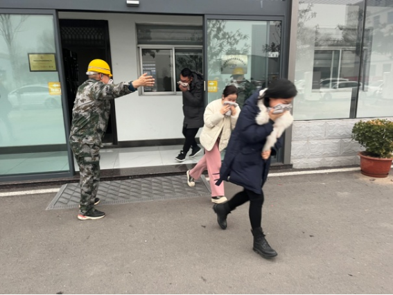 事故假设在上班时间,会议室发生火灾,大火迅速蔓延,浓烟滚滚,严重威胁人员生命及造成财产损失(在指定地点点燃白色烟雾弹)。应急救援各组迅速抵达现场,综合协调组、灭火行动组、疏散引导组分工明确迅速投入抢险,在火灾面前临危不乱,有序开展安全疏散、快速灭火,整个过程紧张有序、实用性强。