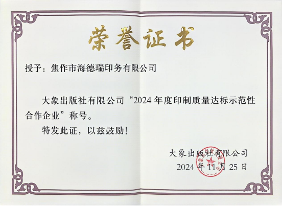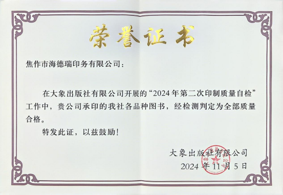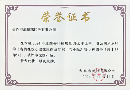 在大象出版社有限公司开展的 “2024年度第二次印制质量自检”工作中,我公司承印的大象社各品种图书,经检验判定为全部质量合格。 同时在大象出版社组织的 2024年度图书印制质量创优评比中,我公司所承印的《省情礼仪心理健康综合知识 六年级》等3种图书(共计14印张),被评 为优质产品。